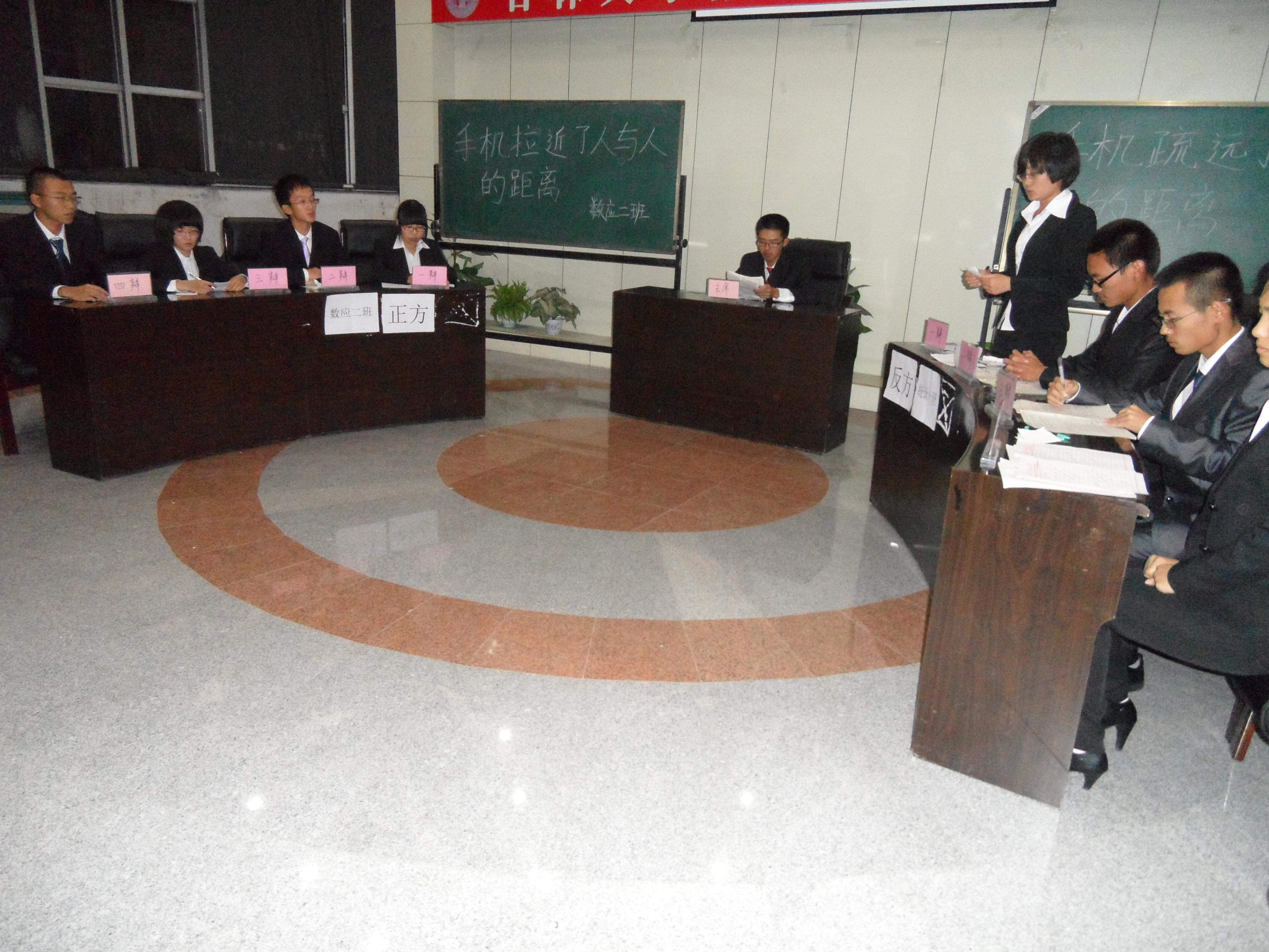 本次比赛分为两场,队员分别就“手机是拉近还是疏远了人们的距离”和“信息爆炸的今天我们是否离真相越来越近”两个主题展开了唇枪舌战的争辩。辩手们思维敏捷,针锋相对,不断将比赛推向高潮,赢得场上评委以及观众的热烈掌声。在观众提问阶段,现场观众都积极参与,充分体现了团队精神。比赛结束后,评委分别对正反方选手进行了点评,指出双方的优缺点,并提出宝贵意见。最终获得胜利进入下一轮比赛的分别是统计1班和计算2班,同时来自数应2班的二辩和统计1班的一辩分别获得两场辩论的最佳辩手称号。
