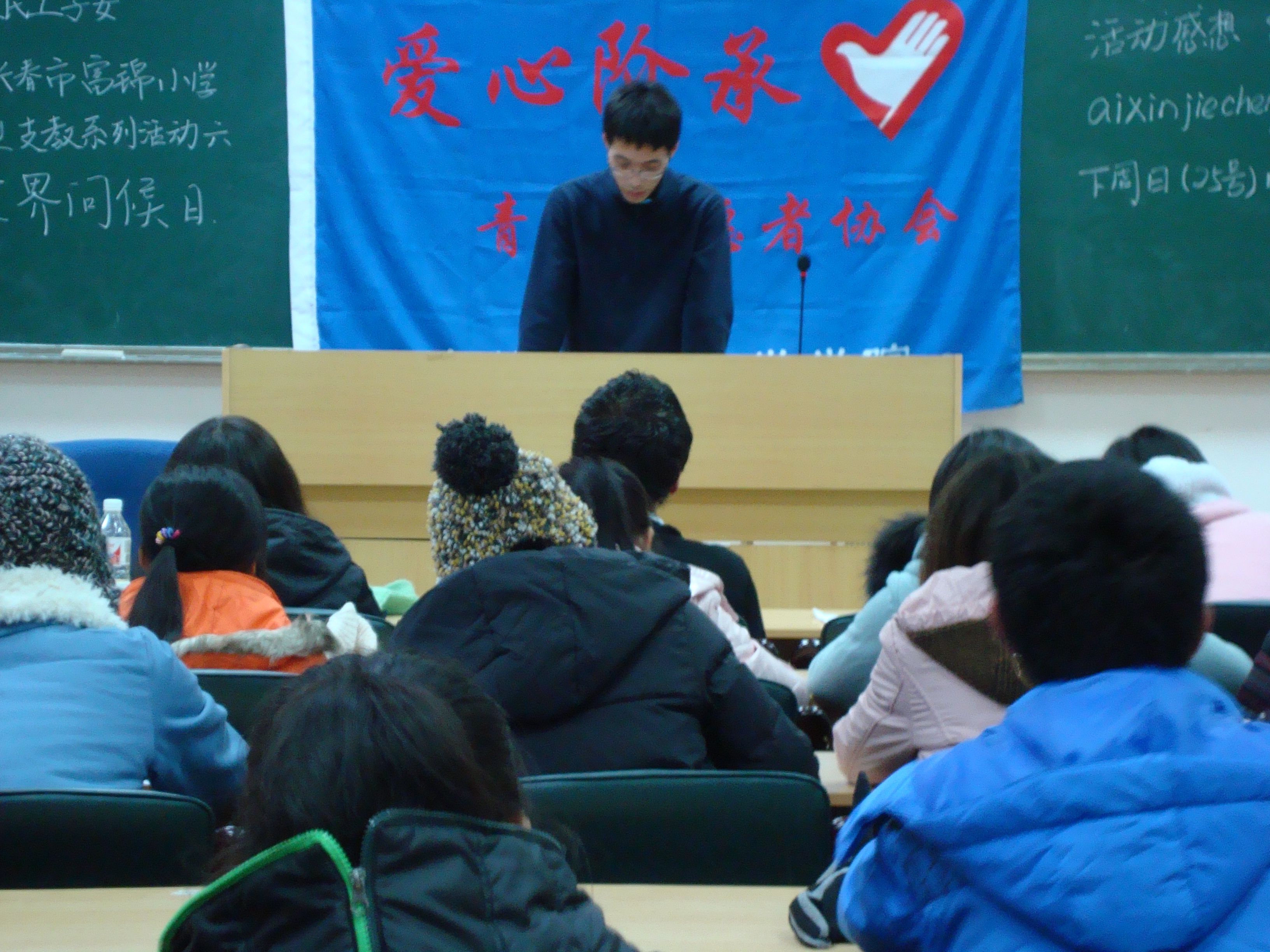 2012年11月15日晚6点,beat365中国官方网站爱心阶承青年志愿者协会在数学楼一楼报告厅举办了“走进长春市富锦小学--大型支教活动”系列之第六届“世界问候日”主题活动的志愿者培训。