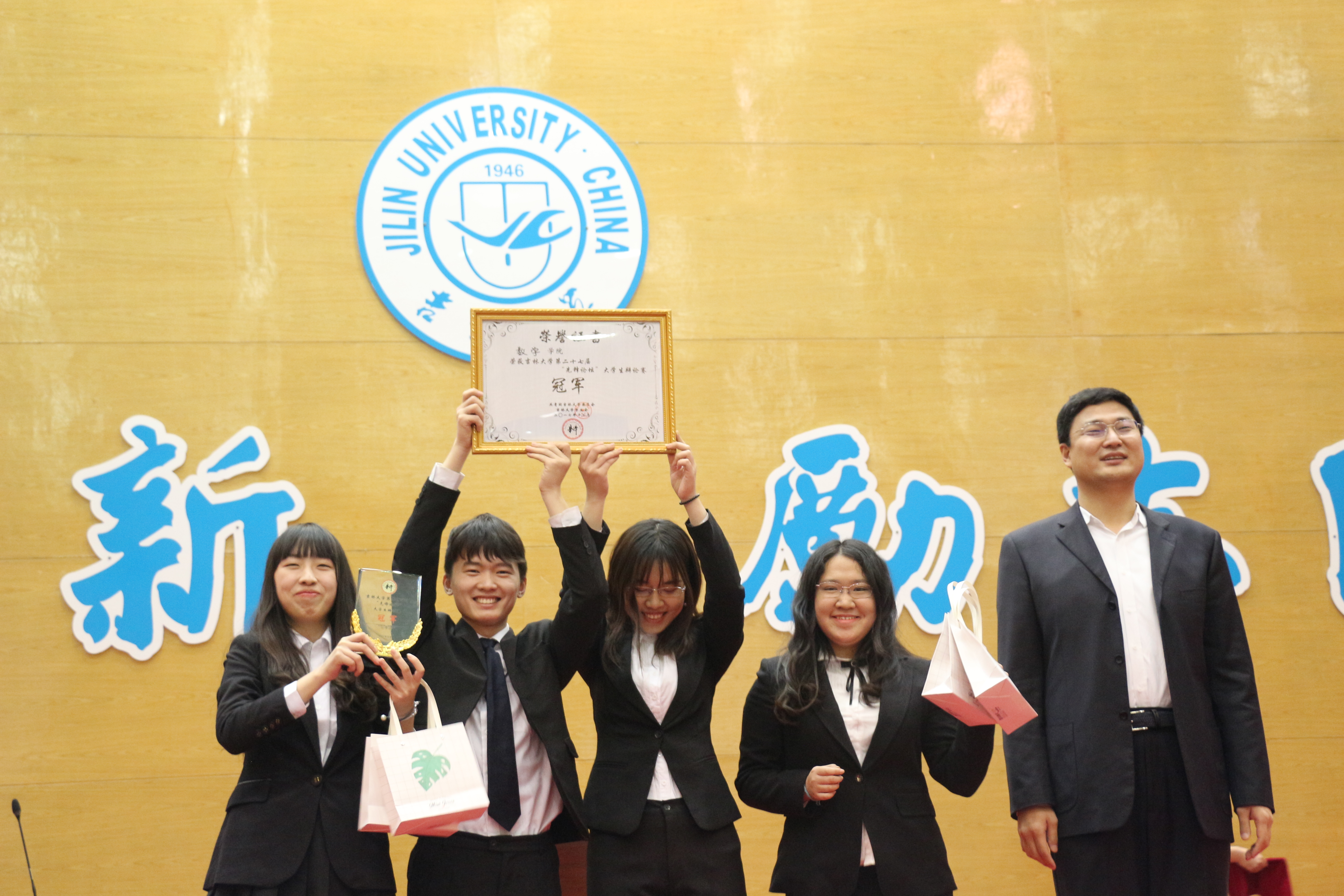 是谁,舌灿莲花,堪使丝竹失色;是谁,唇如利剑,可令管弦无声。在欢呼和呐喊声中决赛拉开序幕,决赛辩题为帮助弱者与制约强者哪一个更能体现道德的意义,数学学院为反方制约强者更能体现道德的意义。我方一辩辛悦开篇立论提出道德的意义在于促进社会和谐发展,并从维护社会秩序,解决社会矛盾,引导正向价值三个方面掷地有声地陈述。我方二辩俞宁宁紧随其后,幽默生动地重申保护和制约的概念,拆解对方观点。应对质询,从容不迫,灵活地化解了对方的进攻。我方三辩程蕾巧妙发问,从动机过程结果三个角度准确地论述了制约强者所能体现出的道德意义。我方四辩刚铭君字字珠玑,鞭辟入里,动之以理晓之以情,一句“不要人夸颜色好,只留清气满乾坤”声震全场,引得掌声雷动。评委老师从学理的角度阐释了对辩题的理解并对场上辩手提出了表扬。在万众期待中,主席宣布结果,数学学院荣获冠军!共青团吉林省副书记牟大鹏为数学学院颁发了奖状以及奖杯。