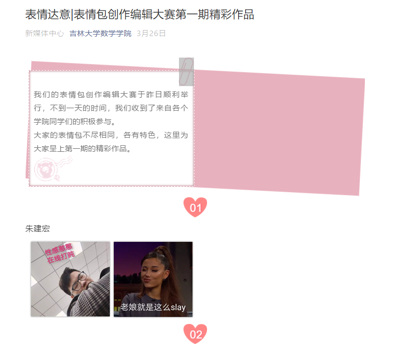 新媒体中心于3月24日至3月25日进行活动的前期准备,准备包括活动方案的策划,奖品的准备和活动宣传,布置下任务后,交由各班班长通知,在校本科学生自愿参加,独立设计,严禁抄袭,保证作品的原创性。同时数院微信平台等全线宣传造势,宣传期间由新闻与摄影部全程持续跟踪指导并耐心回答同学们有关本活动的问题。紧接着3月25日至3月27日我院公众号上进行了前期宣传与作品征集。每个设计作品须保证原创性,保证表情包内容有意义,没有不文明用语,并以图稿的形式呈现。参赛选手将图稿、对应文字以及联系方式发送至数学学院微信公众号后台,由负责人把参赛同学所设计的作品进行整理,并于次日在推送中展示,作品发布后,引起了同学们在公众号留言区域的广泛讨论。并于3月28日至3月29日在平台上发布线上投票,投票结果于9日晚上在平台上公布,颁发一个一等奖、两个二等奖、三个三等奖,以及参与奖,负责人及时联系获奖参赛者,送出奖品及合影留念,于15日晚在推送中放出颁奖照片及获奖作品。