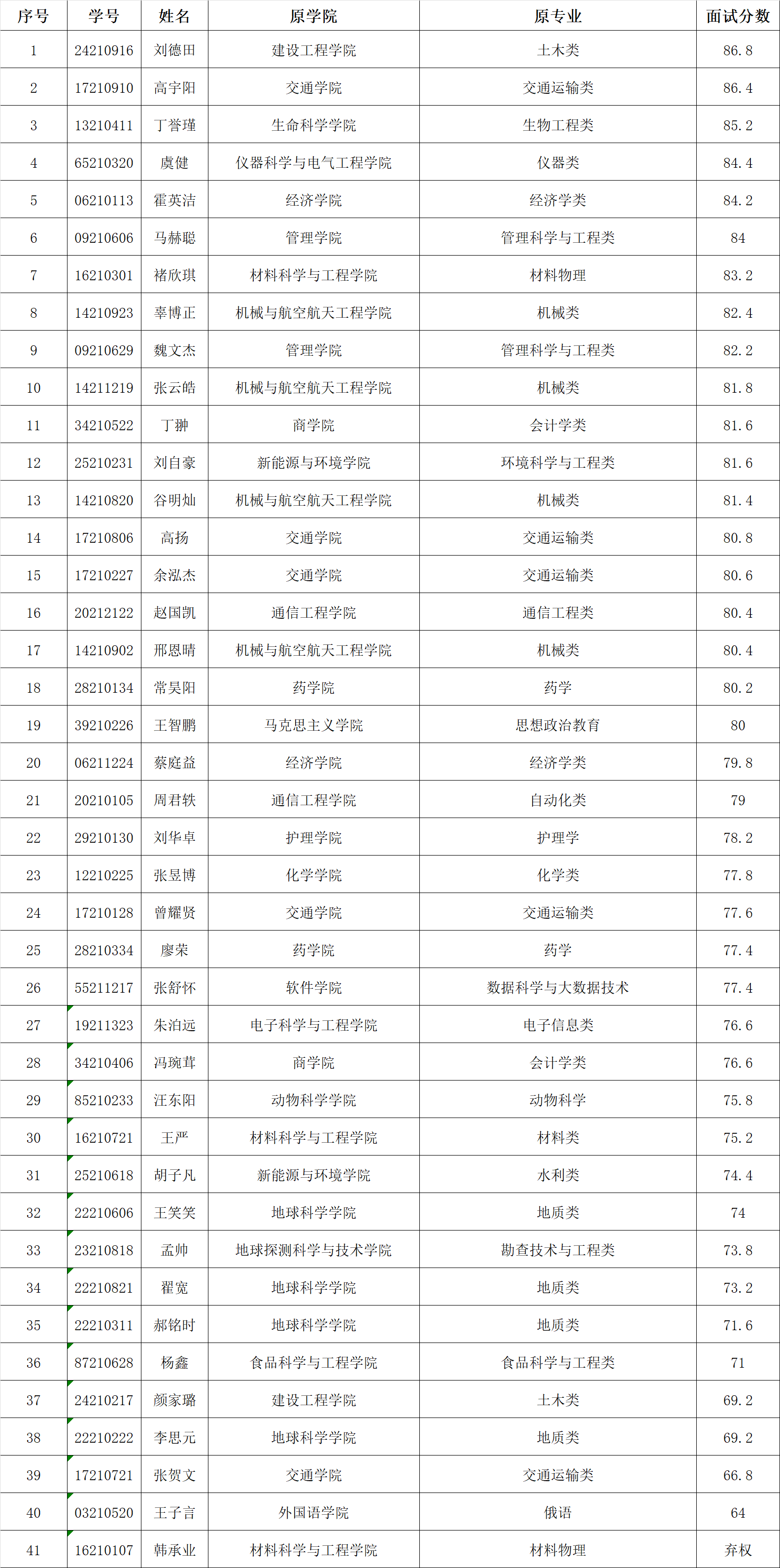 根据《吉林大学本科学生转专业管理规定》及《关于吉林大学2021级本科生考核转专业(类)工作的通知》的有关精神,结合我院实际情况,经评审组考核评议,现将数学学院转专业拟录取人员名单予以公示。