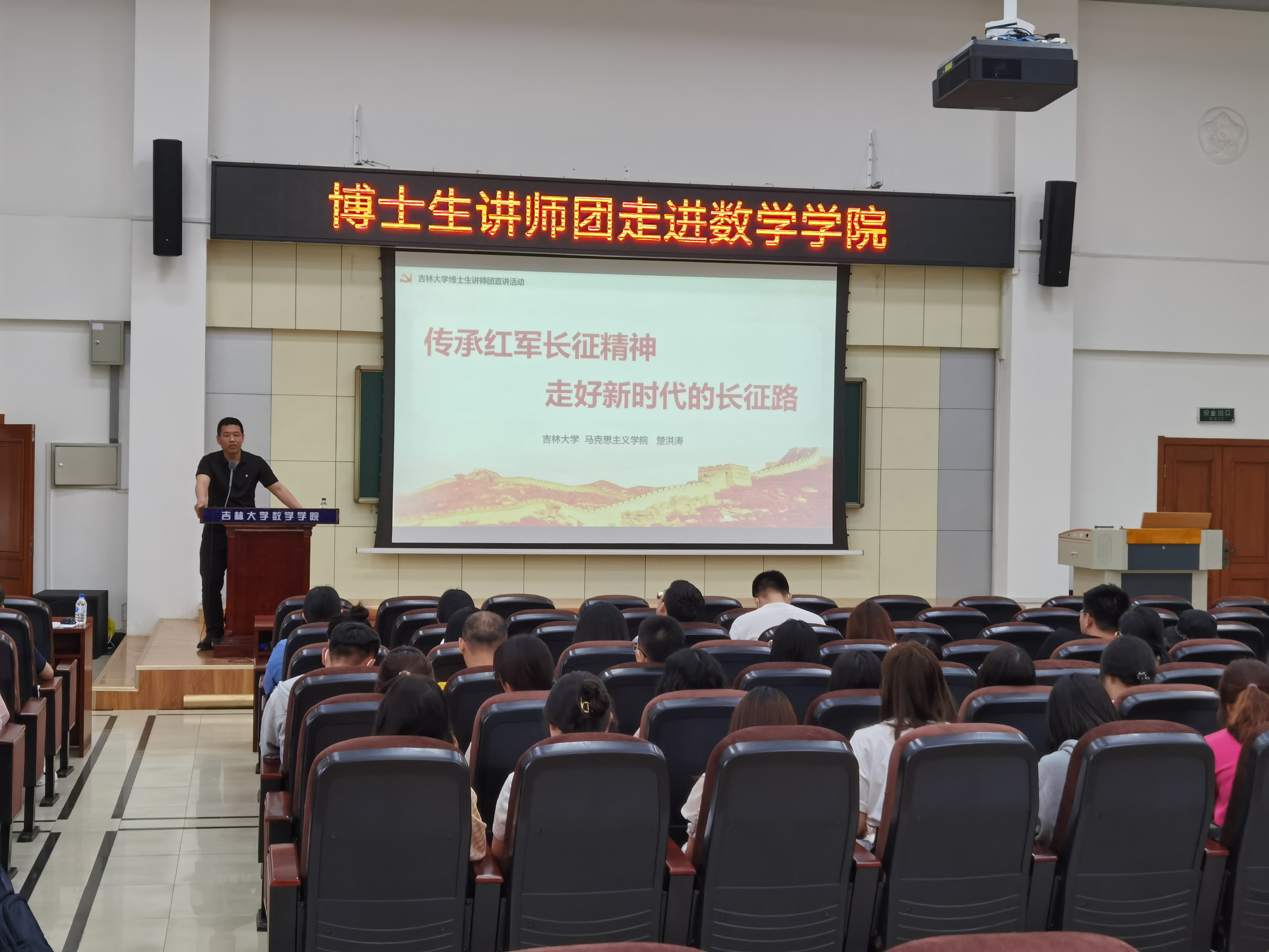 为庆祝中国共产党建党一百周年,进一步让更广大研究生接受党史学习教育,在党史学习教育中“明理、增信、崇德、力行”,研究生工作部委派博士生讲师团进研究生培养单位为研究生党支部开展党史学习教育宣讲活动。2021年5月18日,马克思学院楚洪涛讲师来到数学学院进行党史学习教育宣讲,宣讲主题为“传承红军长征精神,走好新时代长征路”。