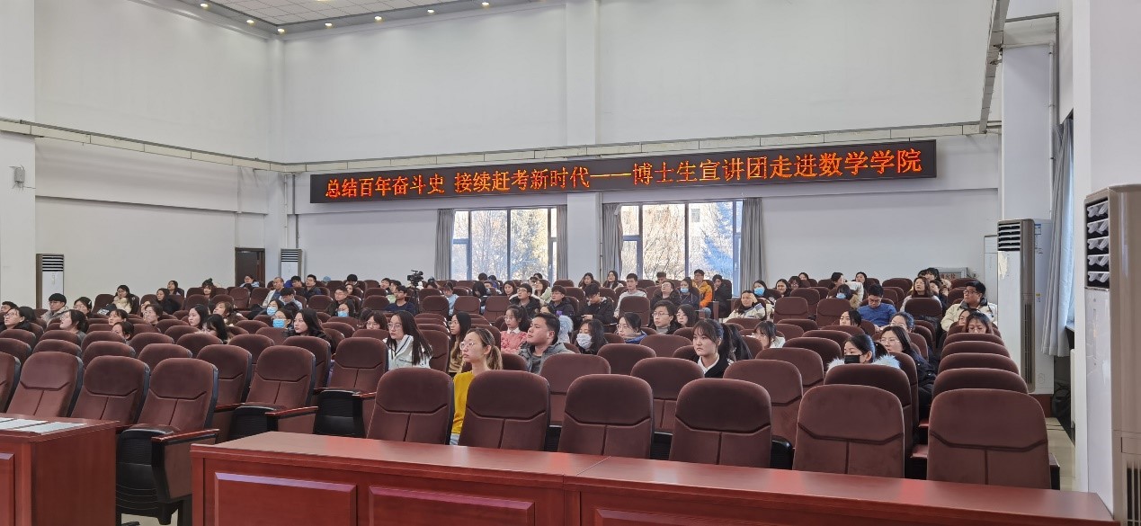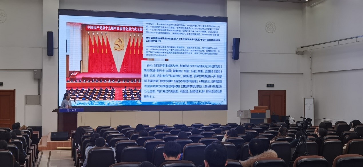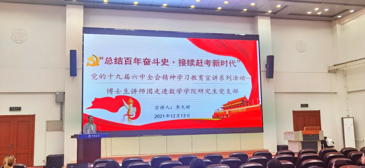 为深入学习贯彻党的十九届六中全会精神,提升广大研究生思想政治素质,积极响应校党委研究生工作部工作要求,2021年12月13日,数学学院邀请吉林大学博士生讲师团讲师李天娇博士于数学楼二楼报告厅进行了十九届六中全会精神学习教育宣讲。本次宣讲的主题为“总结百年奋斗史•接续赶考新时代”——新中国以来国家领导人新闻发布的机制演变与基本经验”,学院研究生党支部党员、预备党员、积极分子参与了此次宣讲活动。