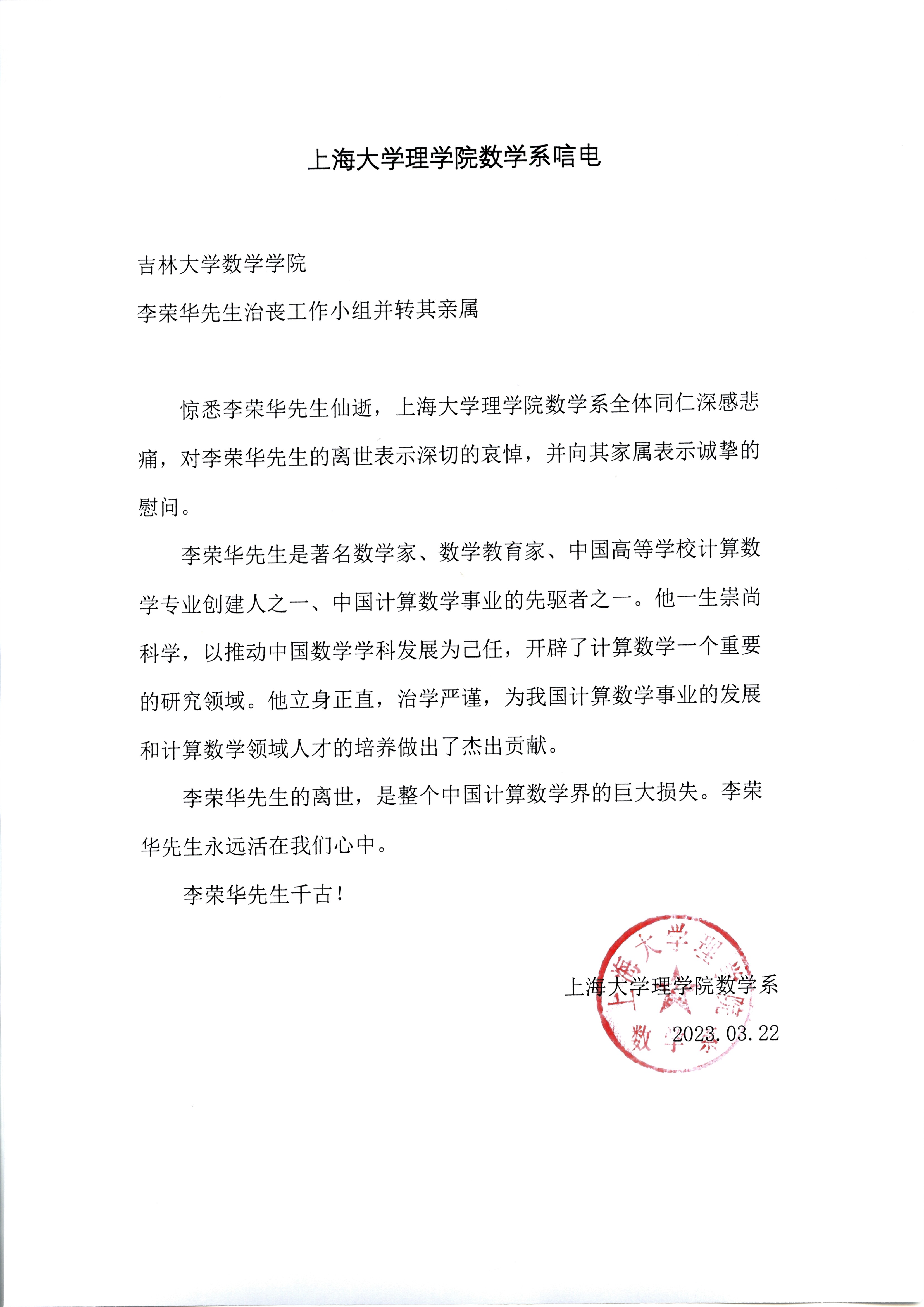 上海大学理学院数学系唁电