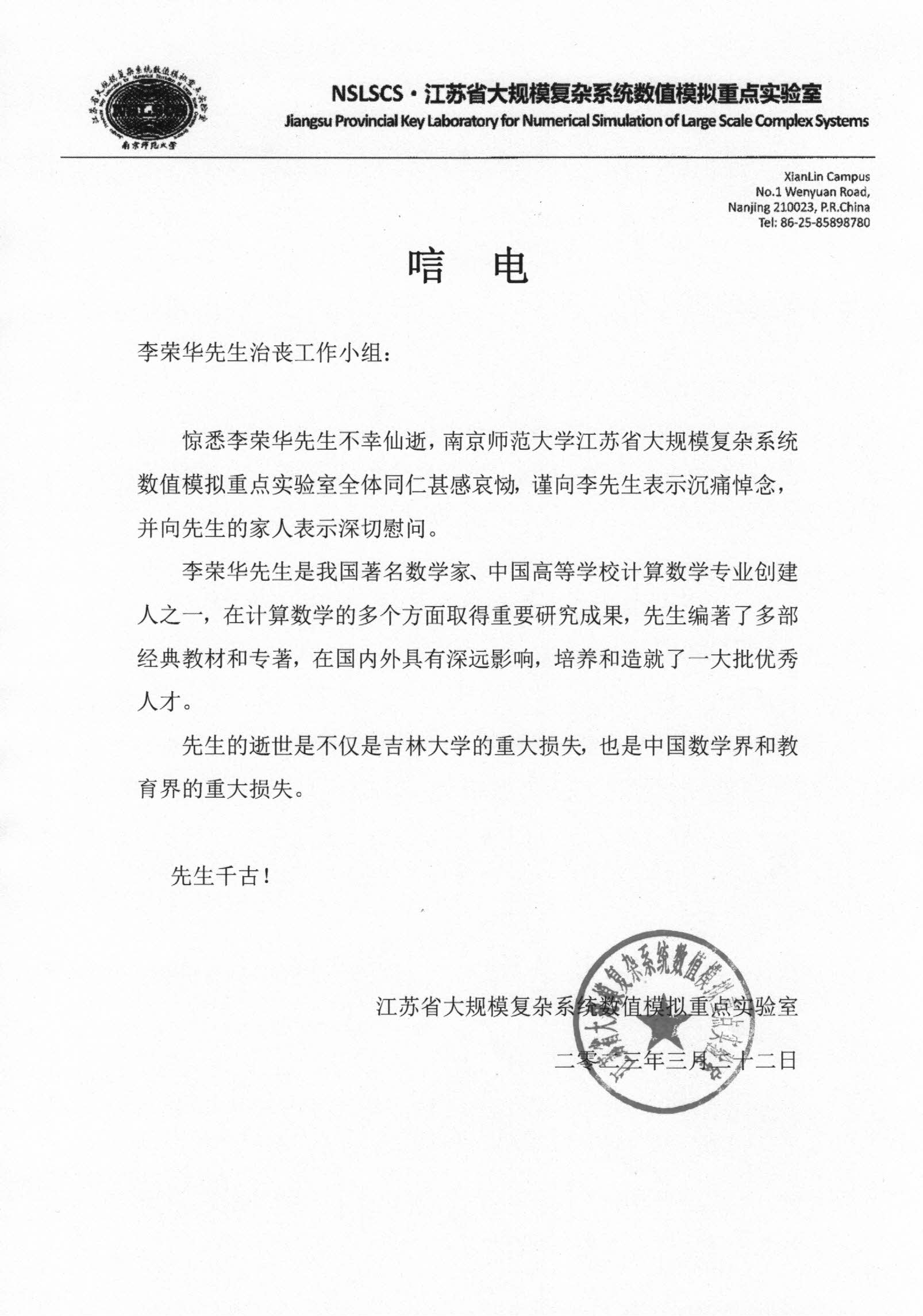 江苏省大规模复杂系统数值模拟重点实验室唁电